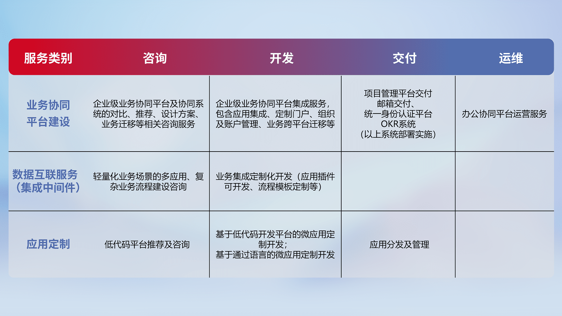 针对钉钉、、、企微、、、IDaas等平台级产品提供产品的规划、、、、方案、、、、交付、、、定制化开发等服务,,,实现如统一协同办公、、、智能客户服务、、、混合会议管理、、、智能数据查询、、等业务场景,,,,实现数字化转型。。