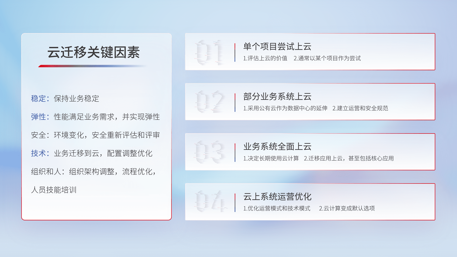 结合实际业务,,从规划设计、、云平台选型、、、云原生改造、、、数据迁移、、、、集成交付,,,,迁移全过程为客户识别最佳上云路径,,,做好风险识别管理,,,,设计网络架构、、、身份权限、、、、安全审计合规、、、操作审计、、、、日志审计、、、监控告警策略、、多站点容灾设计等,,对云上基础设施进行整体规划,,提升IT治理水平,,,以满足弹性、、、高可用、、、高性能的需求。。。