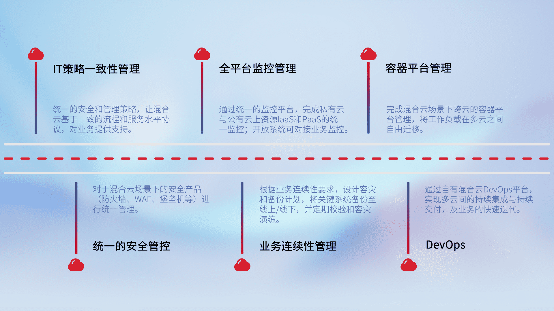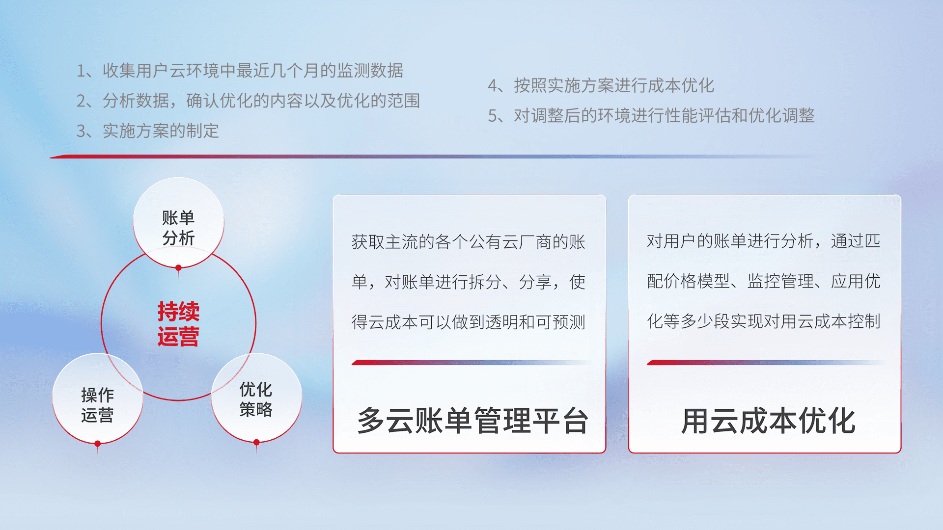 通过多云纳管,,以统一的资源数据模型把客户的云资源进行抽象和封装,,进而实现对多云资源的统一操作,,保障云资源管理的可靠性、、稳定性与可用性。。。。量身定制化运维内容,,,配置、、、开发运维、、、、补丁管理、、、备份、、、监控、、认证和访问管理、、审计和日常巡检等,,保障在用云过程中的可靠度,,,稳定度以及高可用率。。